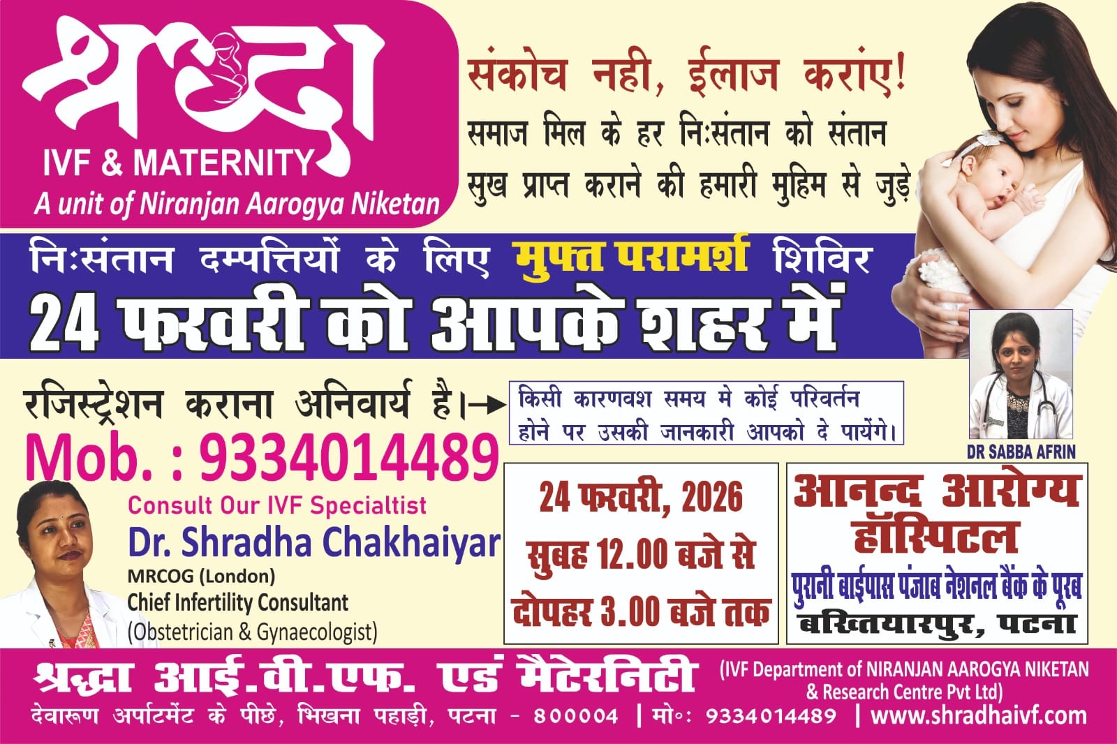 A ray of hope for childless couples, Dr. Shradha Chakhaiyar, a renowned IVF specialist from Patna, will be available in your hometown of Bakhtiyar Pur, Patna (Bihar) on February 24th, from 12:00 PM to 3:00 PM